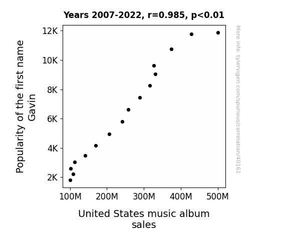 This means 97.1% of the change in the one variable (i.e., United States music album sales) is predictable based on the change in the other (i.e., Popularity of the first name Gavin) over the 16 years from 2007 through 2022.