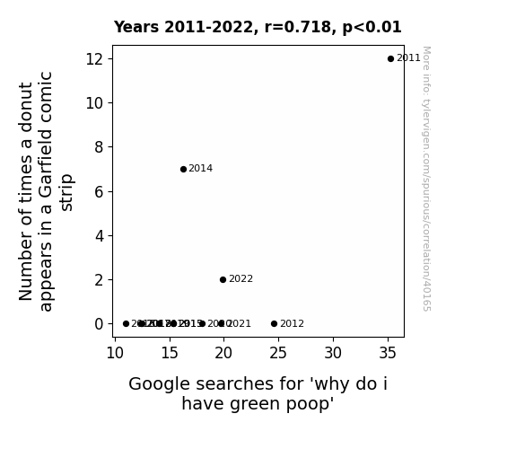 This means 51.6% of the change in the one variable (i.e., Google searches for 'why do i have green poop') is predictable based on the change in the other (i.e., Number of times a donut appears in a Garfield comic strip) over the 12 years from 2011 through 2022.