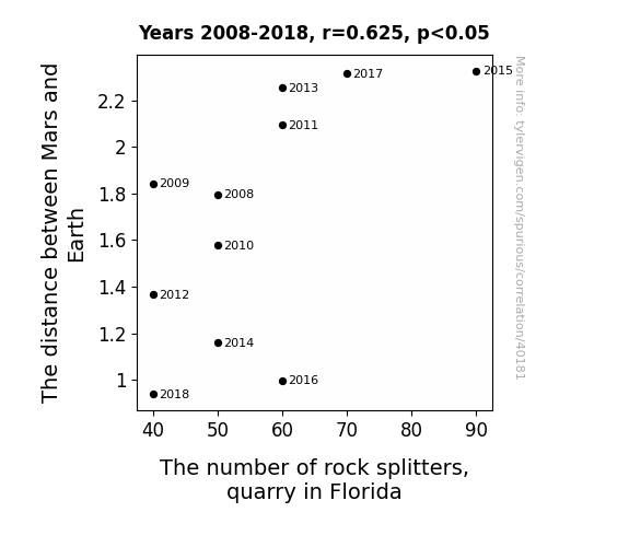 This means 39.1% of the change in the one variable (i.e., The number of rock splitters, quarry in Florida) is predictable based on the change in the other (i.e., The distance between Mars and Earth) over the 11 years from 2008 through 2018.