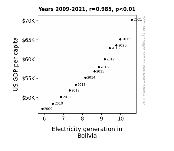 This means 97.1% of the change in the one variable (i.e., Electricity generation in Bolivia) is predictable based on the change in the other (i.e., US GDP per capita) over the 13 years from 2009 through 2021.