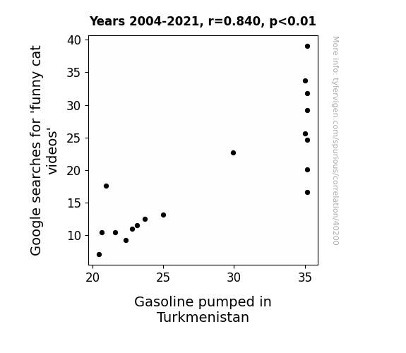 This means 70.6% of the change in the one variable (i.e., Gasoline pumped in Turkmenistan) is predictable based on the change in the other (i.e., Google searches for 'funny cat videos') over the 18 years from 2004 through 2021.