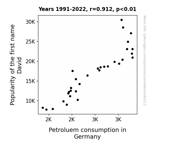 This means 83.2% of the change in the one variable (i.e., Petroluem consumption in Germany) is predictable based on the change in the other (i.e., Popularity of the first name David) over the 32 years from 1991 through 2022.