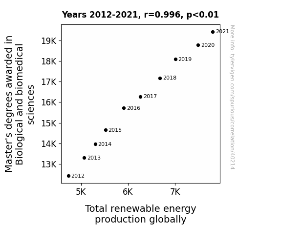 This means 99.2% of the change in the one variable (i.e., Total renewable energy production globally) is predictable based on the change in the other (i.e., Master's degrees awarded in Biological and biomedical sciences) over the 10 years from 2012 through 2021.