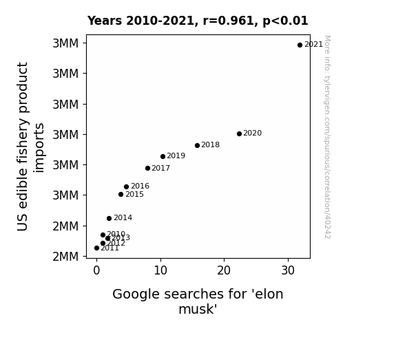 This means 92.4% of the change in the one variable (i.e., Google searches for 'elon musk') is predictable based on the change in the other (i.e., US edible fishery product imports) over the 12 years from 2010 through 2021.