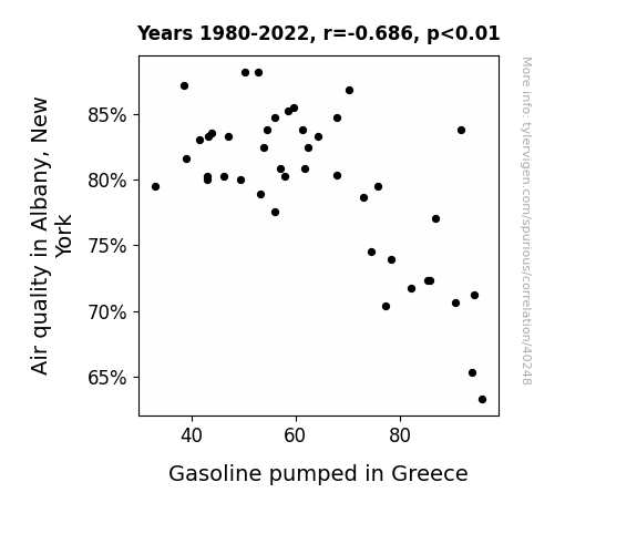 This means 47% of the change in the one variable (i.e., Gasoline pumped in Greece) is predictable based on the change in the other (i.e., Air quality in Albany, New York) over the 43 years from 1980 through 2022.