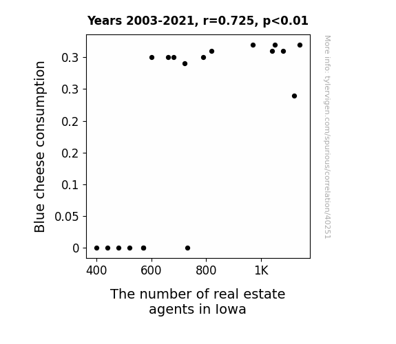 This means 52.6% of the change in the one variable (i.e., The number of real estate agents in Iowa) is predictable based on the change in the other (i.e., Blue cheese consumption) over the 19 years from 2003 through 2021.