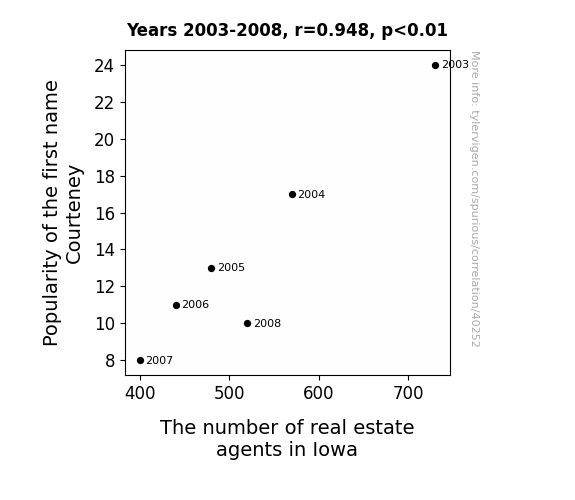 This means 89.9% of the change in the one variable (i.e., The number of real estate agents in Iowa) is predictable based on the change in the other (i.e., Popularity of the first name Courteney) over the 6 years from 2003 through 2008.