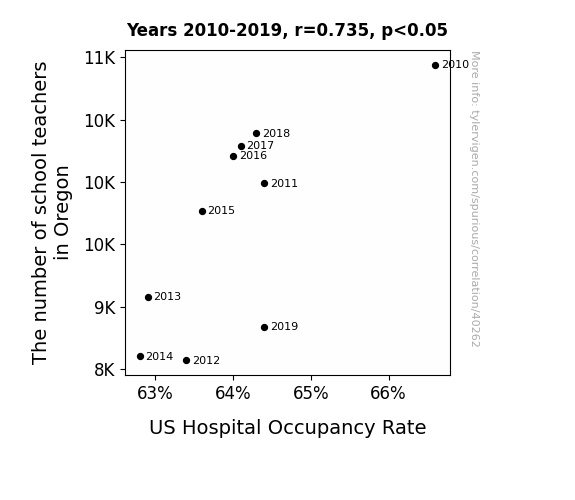 This means 54% of the change in the one variable (i.e., US Hospital Occupancy Rate) is predictable based on the change in the other (i.e., The number of school teachers in Oregon) over the 10 years from 2010 through 2019.