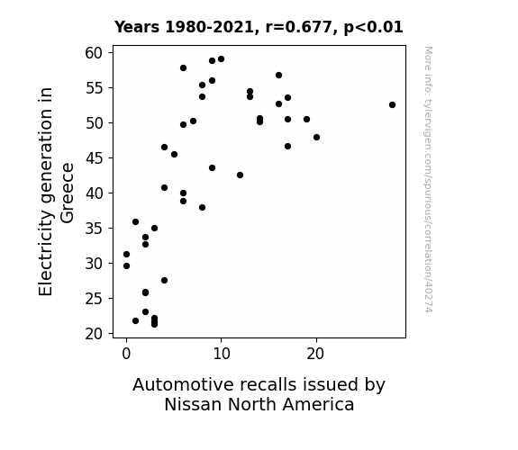 This means 45.8% of the change in the one variable (i.e., Automotive recalls issued by Nissan North America) is predictable based on the change in the other (i.e., Electricity generation in Greece) over the 42 years from 1980 through 2021.