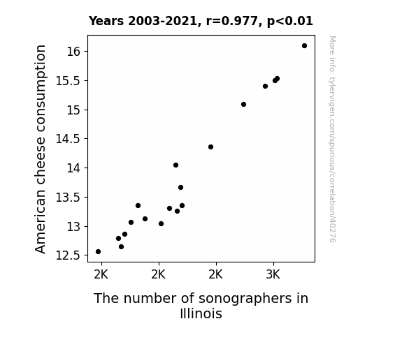 This means 95.4% of the change in the one variable (i.e., The number of sonographers in Illinois) is predictable based on the change in the other (i.e., American cheese consumption) over the 19 years from 2003 through 2021.
