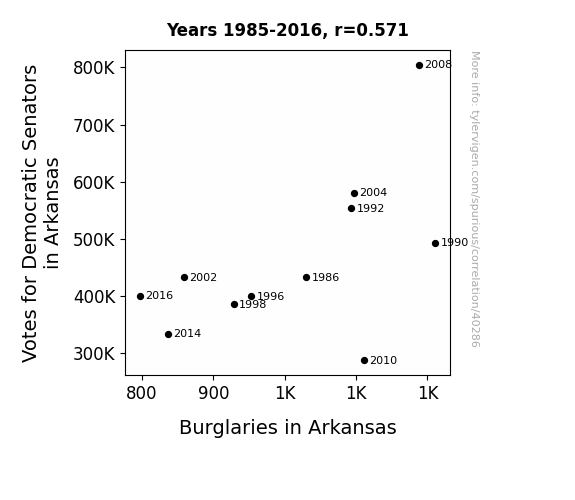 This means 32.6% of the change in the one variable (i.e., Burglaries in Arkansas) is predictable based on the change in the other (i.e., Votes for Democratic Senators in Arkansas) over the 11 years from 1985 through 2016.
