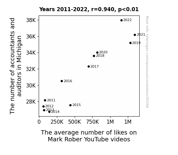 This means 88.4% of the change in the one variable (i.e., The average number of likes on Mark Rober YouTube videos) is predictable based on the change in the other (i.e., The number of accountants and auditors in Michigan) over the 12 years from 2011 through 2022.