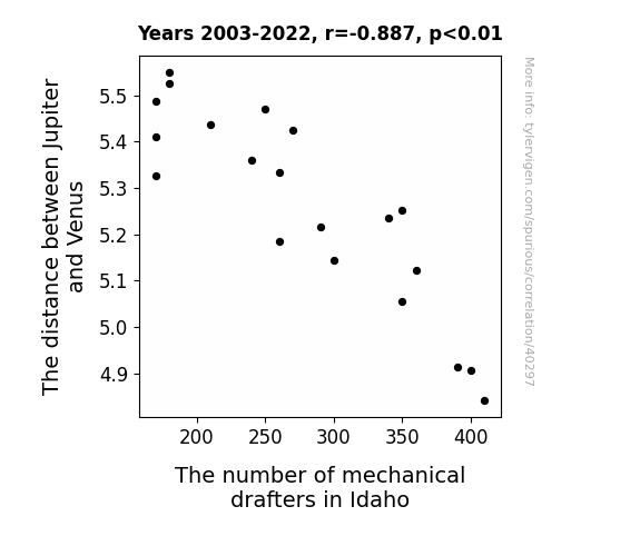 This means 78.8% of the change in the one variable (i.e., The number of mechanical drafters in Idaho) is predictable based on the change in the other (i.e., The distance between Jupiter and Venus) over the 20 years from 2003 through 2022.