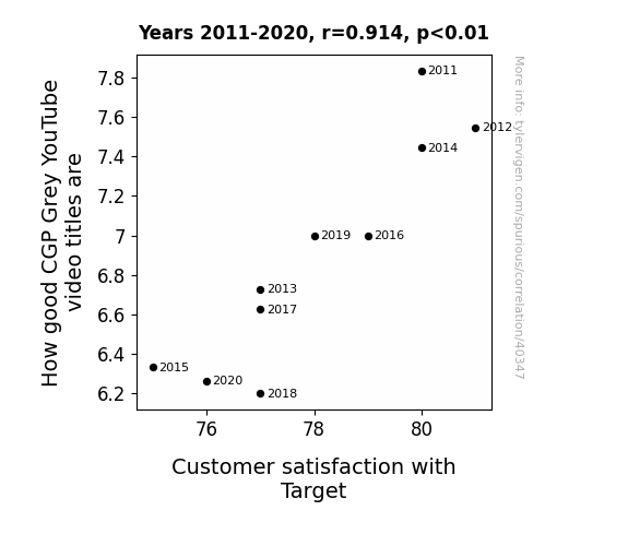 This means 83.5% of the change in the one variable (i.e., Customer satisfaction with Target) is predictable based on the change in the other (i.e., How good CGP Grey YouTube video titles are) over the 10 years from 2011 through 2020.
