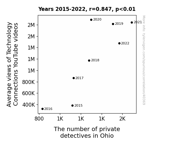 This means 71.8% of the change in the one variable (i.e., The number of private detectives in Ohio) is predictable based on the change in the other (i.e., Average views of Technology Connections YouTube videos) over the 8 years from 2015 through 2022.