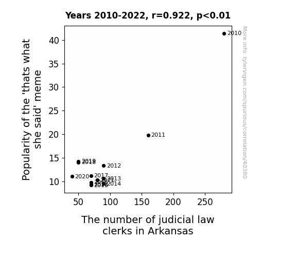 This means 85.1% of the change in the one variable (i.e., The number of judicial law clerks in Arkansas) is predictable based on the change in the other (i.e., Popularity of the 'thats what she said' meme) over the 13 years from 2010 through 2022.