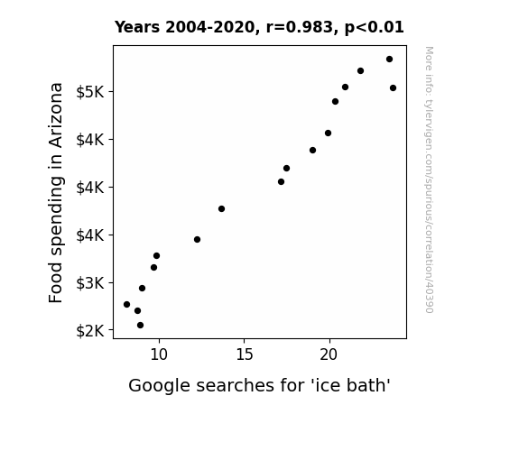 This means 96.6% of the change in the one variable (i.e., Google searches for 'ice bath') is predictable based on the change in the other (i.e., Food spending in Arizona) over the 17 years from 2004 through 2020.