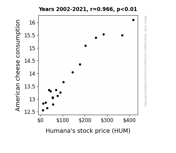 This means 93.3% of the change in the one variable (i.e., Humana's stock price (HUM)) is predictable based on the change in the other (i.e., American cheese consumption) over the 20 years from 2002 through 2021.