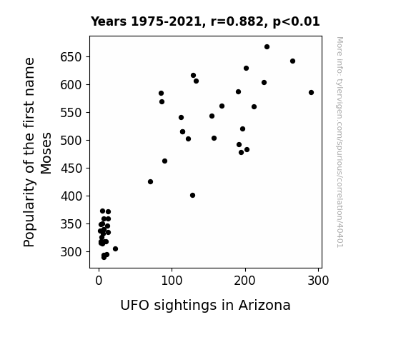 This means 77.7% of the change in the one variable (i.e., UFO sightings in Arizona) is predictable based on the change in the other (i.e., Popularity of the first name Moses) over the 47 years from 1975 through 2021.