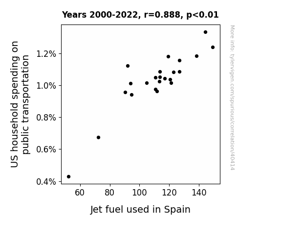 This means 78.8% of the change in the one variable (i.e., Jet fuel used in Spain) is predictable based on the change in the other (i.e., US household spending on public transportation) over the 23 years from 2000 through 2022.