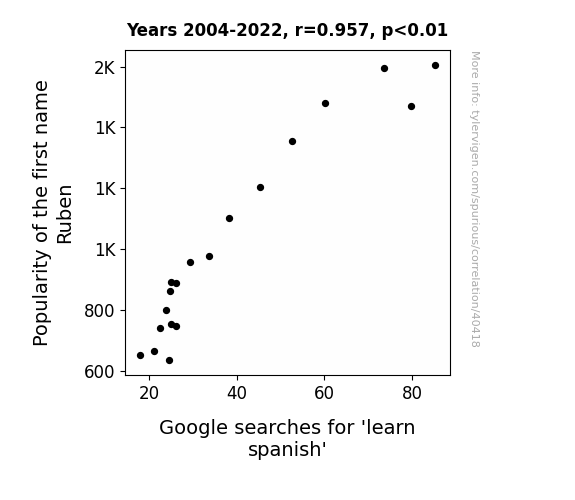 This means 91.6% of the change in the one variable (i.e., Google searches for 'learn spanish') is predictable based on the change in the other (i.e., Popularity of the first name Ruben) over the 19 years from 2004 through 2022.