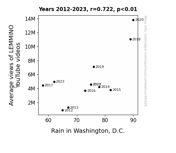 This means 52.1% of the change in the one variable (i.e., Rain in Washington, D.C.) is predictable based on the change in the other (i.e., Average views of LEMMiNO YouTube videos) over the 12 years from 2012 through 2023.