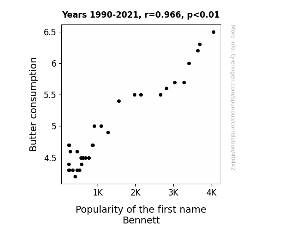 This means 93.3% of the change in the one variable (i.e., Popularity of the first name Bennett) is predictable based on the change in the other (i.e., Butter consumption) over the 32 years from 1990 through 2021.