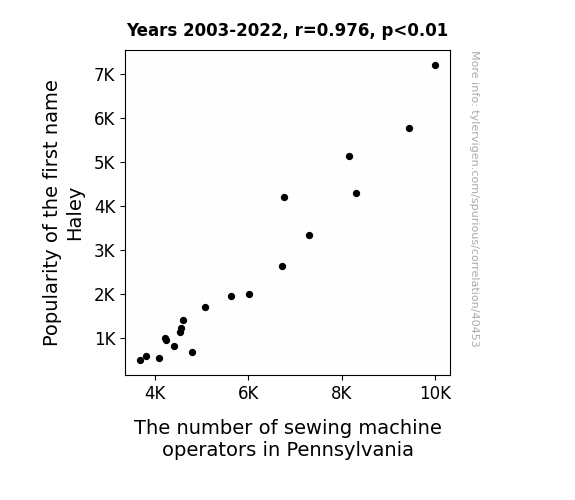 This means 95.2% of the change in the one variable (i.e., The number of sewing machine operators in Pennsylvania) is predictable based on the change in the other (i.e., Popularity of the first name Haley) over the 20 years from 2003 through 2022.