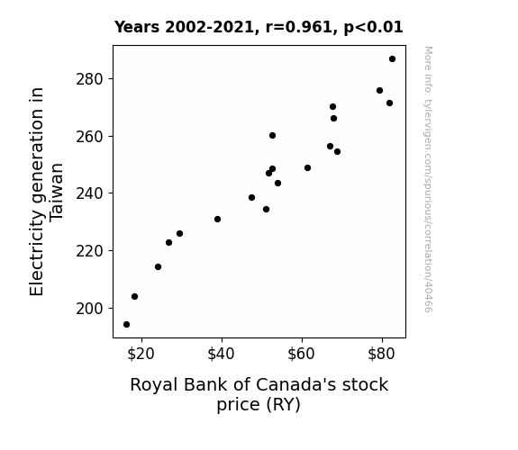 This means 92.3% of the change in the one variable (i.e., Royal Bank of Canada's stock price (RY)) is predictable based on the change in the other (i.e., Electricity generation in Taiwan) over the 20 years from 2002 through 2021.