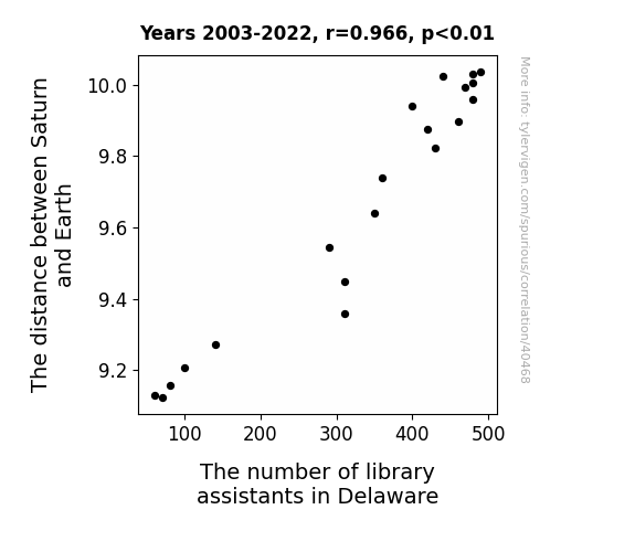 This means 93.3% of the change in the one variable (i.e., The number of library assistants in Delaware) is predictable based on the change in the other (i.e., The distance between Saturn and Earth) over the 20 years from 2003 through 2022.
