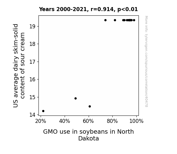 This means 83.5% of the change in the one variable (i.e., GMO use in soybeans in North Dakota) is predictable based on the change in the other (i.e., US average dairy skim-solid content of sour cream) over the 22 years from 2000 through 2021.