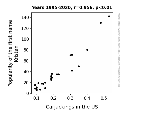 This means 91.5% of the change in the one variable (i.e., Carjackings in the US) is predictable based on the change in the other (i.e., Popularity of the first name Kristan) over the 26 years from 1995 through 2020.