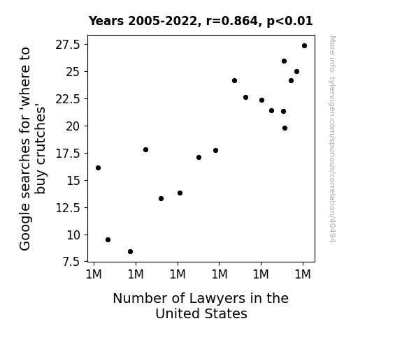This means 74.6% of the change in the one variable (i.e., Number of Lawyers in the United States) is predictable based on the change in the other (i.e., Google searches for 'where to buy crutches') over the 18 years from 2005 through 2022.