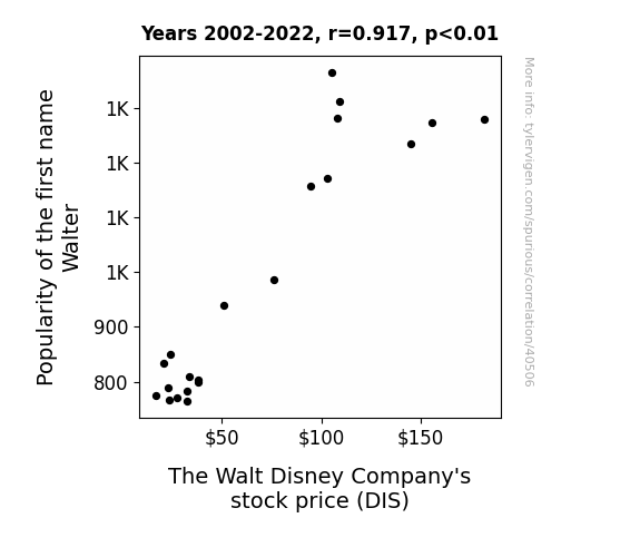 This means 84% of the change in the one variable (i.e., The Walt Disney Company's stock price (DIS)) is predictable based on the change in the other (i.e., Popularity of the first name Walter) over the 21 years from 2002 through 2022.
