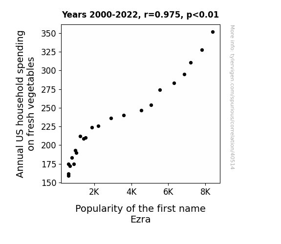 This means 95.1% of the change in the one variable (i.e., Popularity of the first name Ezra) is predictable based on the change in the other (i.e., Annual US household spending on fresh vegetables) over the 23 years from 2000 through 2022.