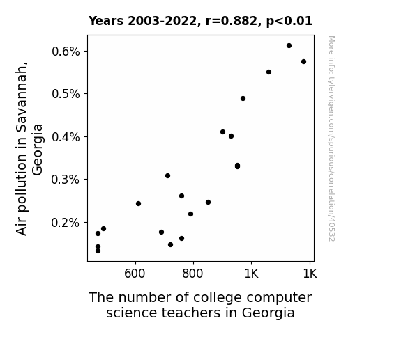 This means 77.8% of the change in the one variable (i.e., The number of college computer science teachers in Georgia) is predictable based on the change in the other (i.e., Air pollution in Savannah, Georgia) over the 20 years from 2003 through 2022.