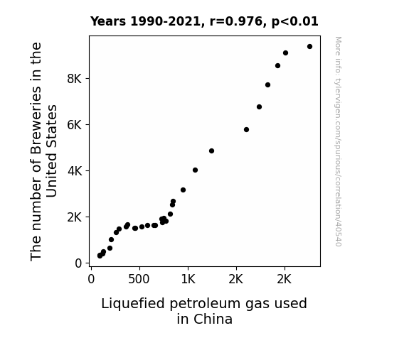 This means 95.3% of the change in the one variable (i.e., Liquefied petroleum gas used in China) is predictable based on the change in the other (i.e., The number of Breweries in the United States) over the 32 years from 1990 through 2021.