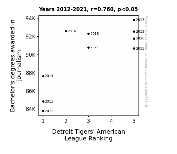 This means 57.8% of the change in the one variable (i.e., Detroit Tigers' American League Ranking) is predictable based on the change in the other (i.e., Bachelor's degrees awarded in journalism) over the 10 years from 2012 through 2021.