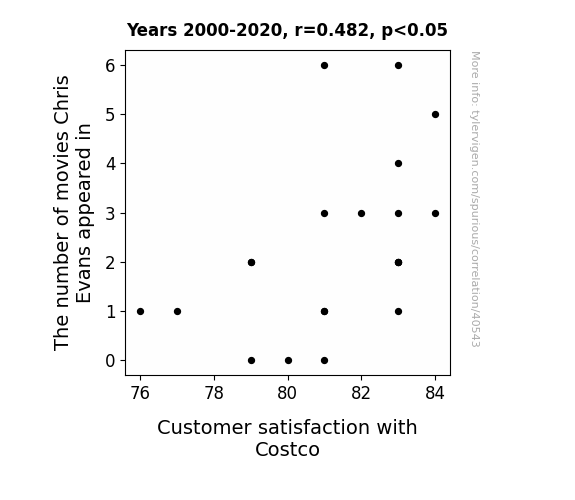 This means 23.2% of the change in the one variable (i.e., Customer satisfaction with Costco) is predictable based on the change in the other (i.e., The number of movies Chris Evans appeared in) over the 21 years from 2000 through 2020.