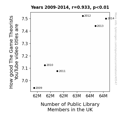 This means 87.1% of the change in the one variable (i.e., Number of Public Library Members in the UK) is predictable based on the change in the other (i.e., How good The Game Theorists YouTube video titles are) over the 6 years from 2009 through 2014.