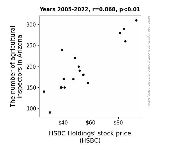 This means 75.3% of the change in the one variable (i.e., HSBC Holdings' stock price (HSBC)) is predictable based on the change in the other (i.e., The number of agricultural inspectors in Arizona) over the 18 years from 2005 through 2022.