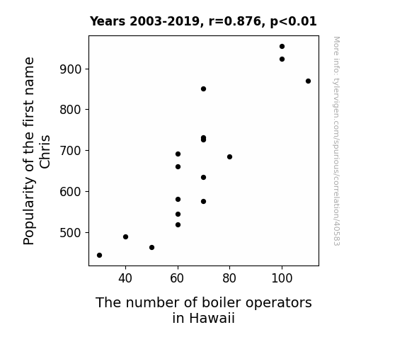 This means 76.7% of the change in the one variable (i.e., The number of boiler operators in Hawaii) is predictable based on the change in the other (i.e., Popularity of the first name Chris) over the 17 years from 2003 through 2019.