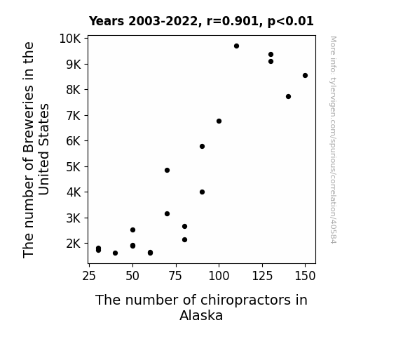 This means 81.2% of the change in the one variable (i.e., The number of chiropractors in Alaska) is predictable based on the change in the other (i.e., The number of Breweries in the United States) over the 20 years from 2003 through 2022.