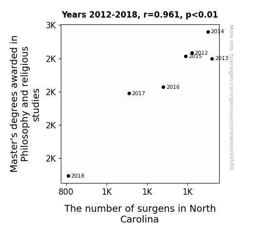 This means 92.3% of the change in the one variable (i.e., The number of surgens in North Carolina) is predictable based on the change in the other (i.e., Master's degrees awarded in Philosophy and religious studies) over the 7 years from 2012 through 2018.