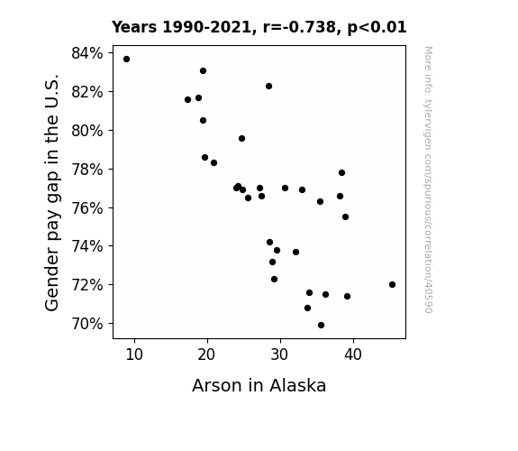 This means 54.5% of the change in the one variable (i.e., Arson in Alaska) is predictable based on the change in the other (i.e., Gender pay gap in the U.S.) over the 32 years from 1990 through 2021.