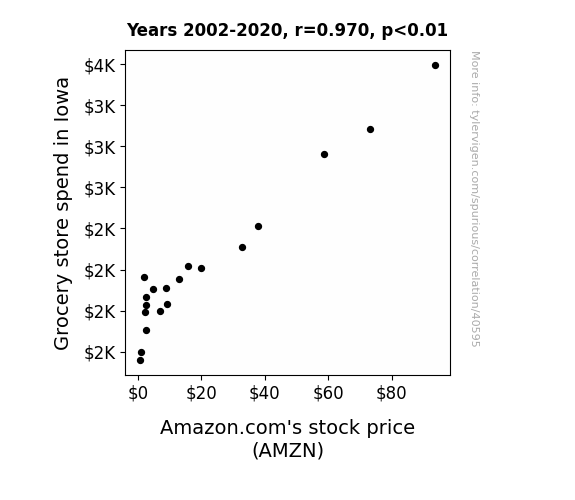 This means 94% of the change in the one variable (i.e., Amazon.com's stock price (AMZN)) is predictable based on the change in the other (i.e., Grocery store spend in Iowa) over the 19 years from 2002 through 2020.