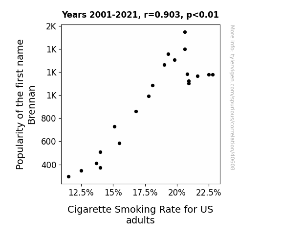 This means 81.6% of the change in the one variable (i.e., Cigarette Smoking Rate for US adults) is predictable based on the change in the other (i.e., Popularity of the first name Brennan) over the 21 years from 2001 through 2021.