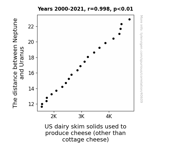 This means 99.5% of the change in the one variable (i.e., US dairy skim solids used to produce cheese (other than cottage cheese)) is predictable based on the change in the other (i.e., The distance between Neptune and Uranus) over the 22 years from 2000 through 2021.