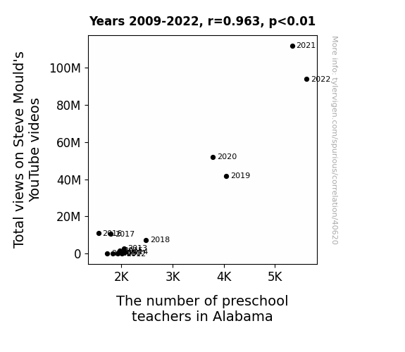 This means 92.7% of the change in the one variable (i.e., The number of preschool teachers in Alabama) is predictable based on the change in the other (i.e., Total views on Steve Mould's YouTube videos) over the 14 years from 2009 through 2022.