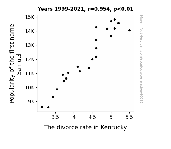 This means 91% of the change in the one variable (i.e., The divorce rate in Kentucky) is predictable based on the change in the other (i.e., Popularity of the first name Samuel) over the 23 years from 1999 through 2021.